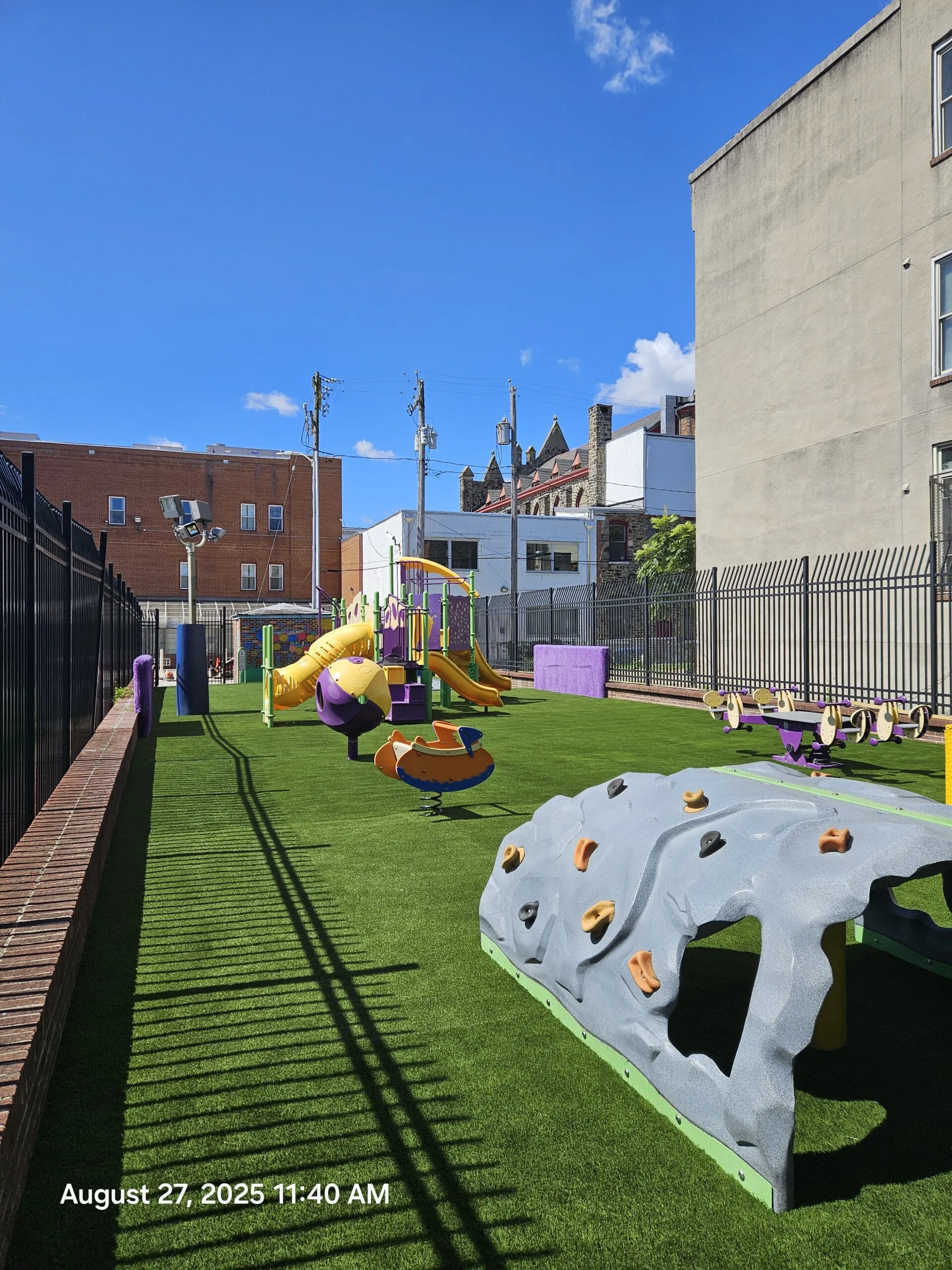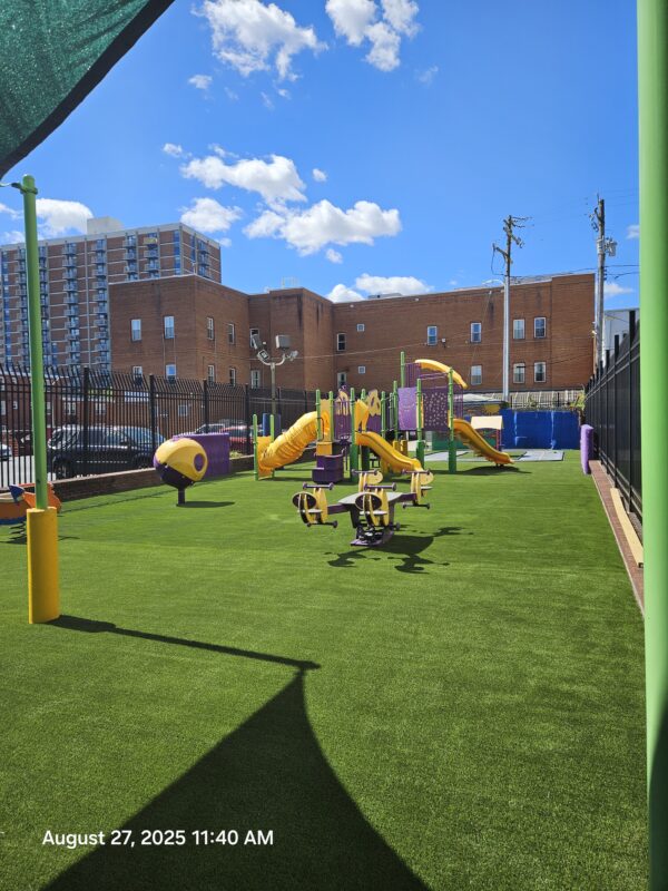 Artificial Turf Playground installation in Baltimore, MD. Date Completed09/26/2025ServicesArtificial Turf BackyardsSwingset Bases and Playset FoundationsSize22' x 55'MaterialsArtificial Grass Installation In Baltimore, MD