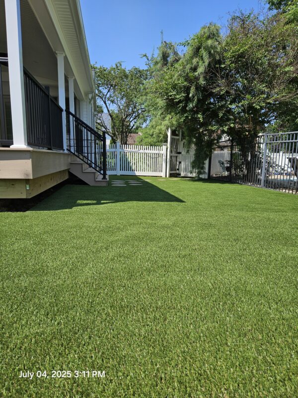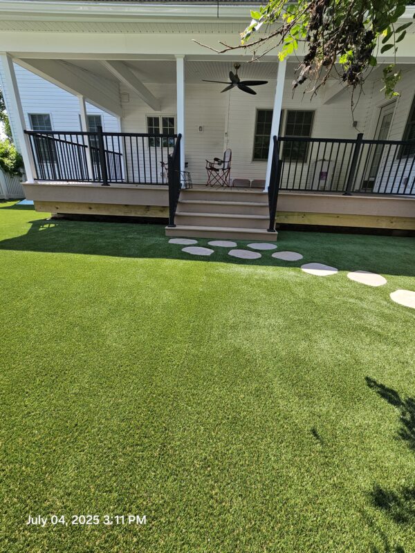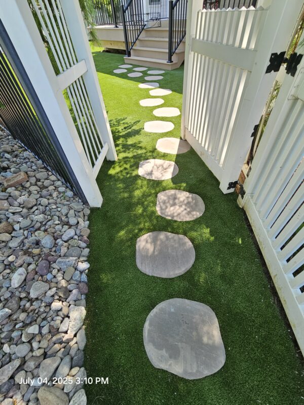 In York, PA, we installed this 12′ by 16′ Artificial Turf Yard. The crew cut around the stones for the walkway to give the yard a clean look.