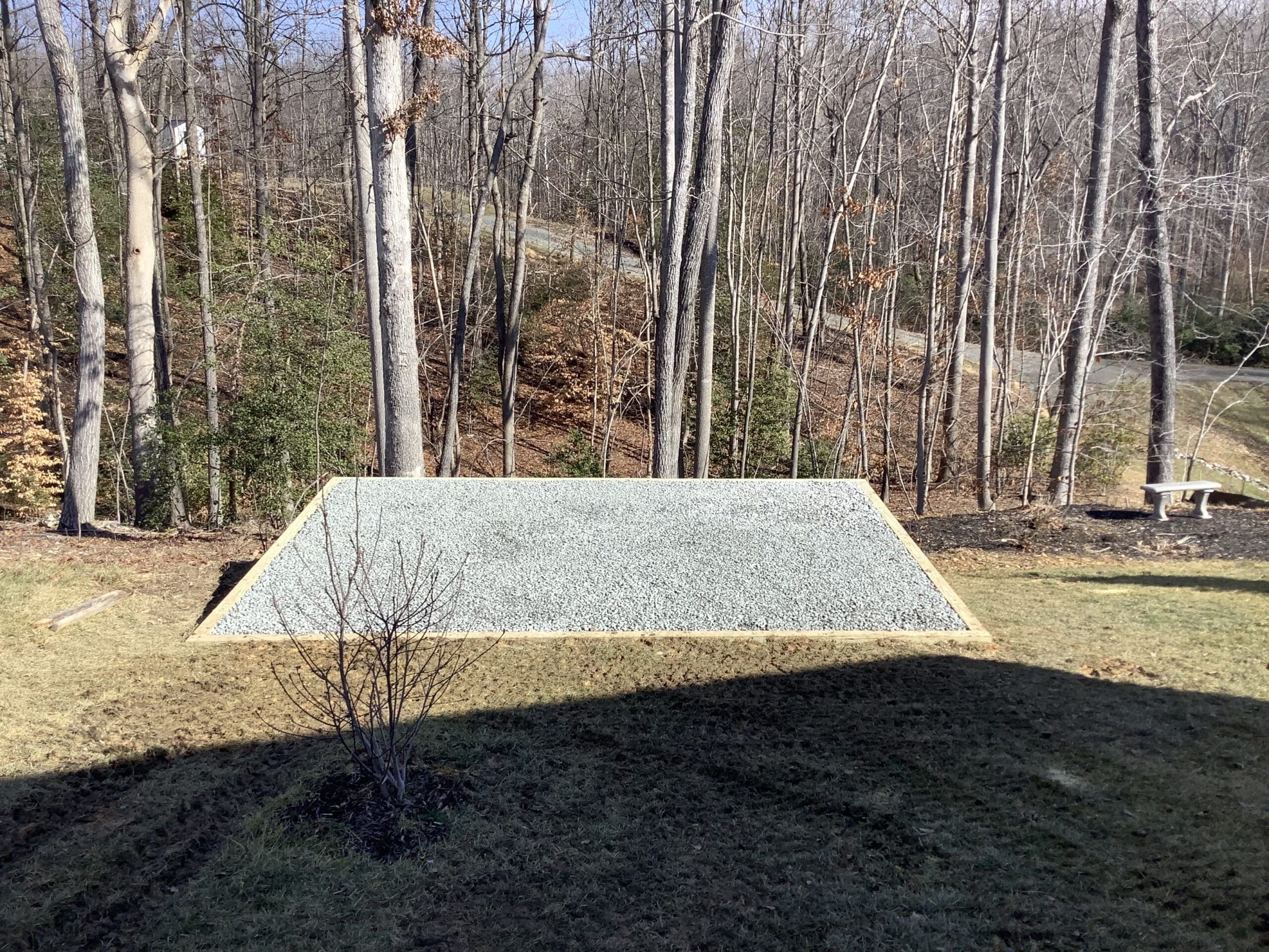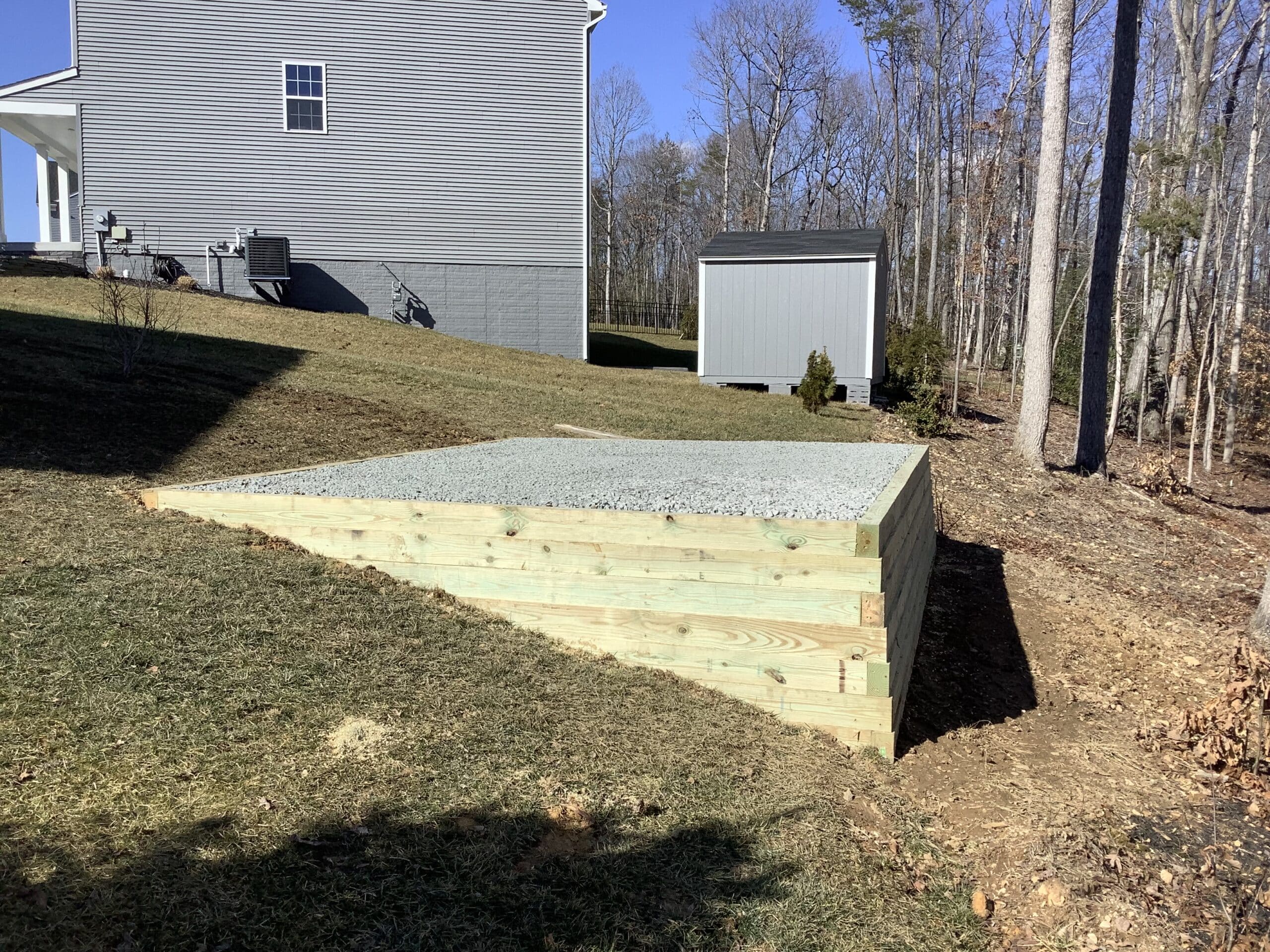 This gravel shed foundation was built in Fredericksburg, VA. It was constructed for Fred. W on a slope. He plans to install a backyard shed on this gravel shed pad.