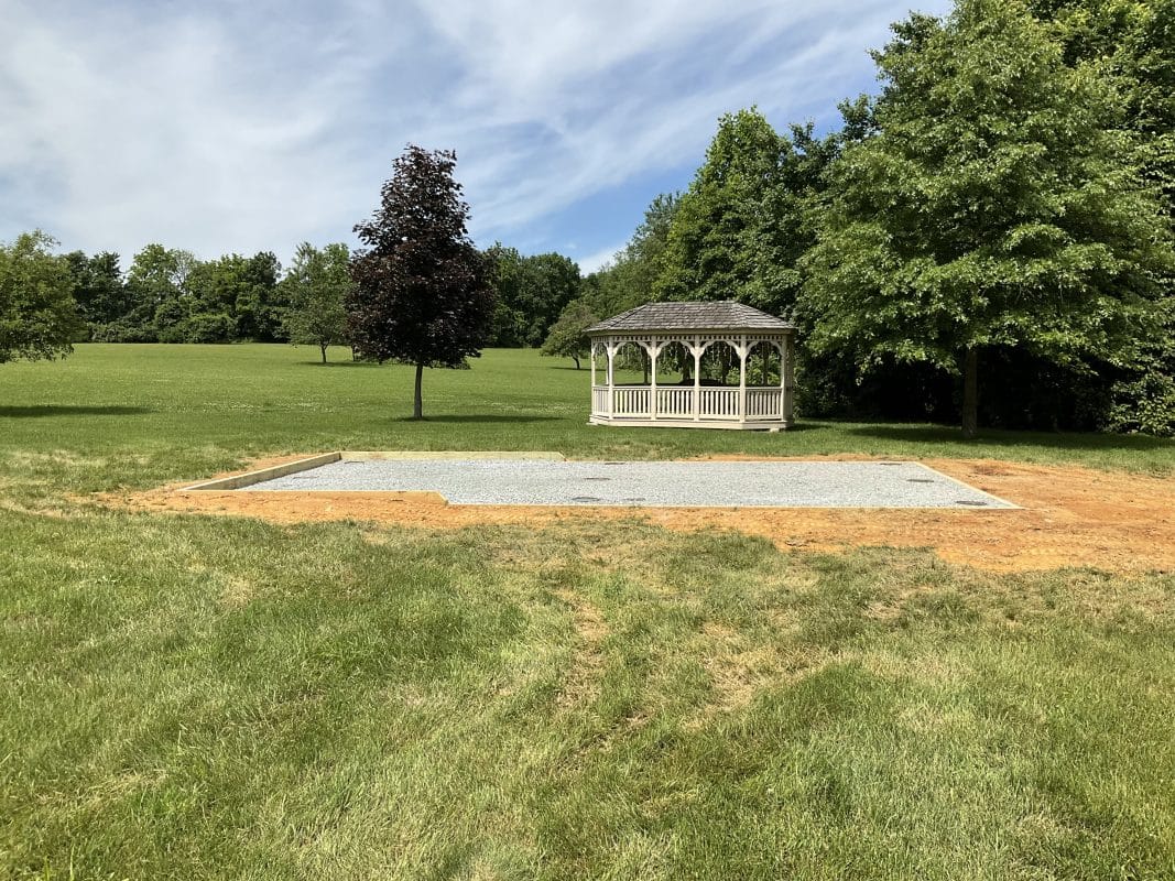 These nine 12″x36″ concrete piers and 16×30 gravel shed foundation were built in Zionsville, PA. They were constructed for Dean H. He plans to install a backyard A-frame garden shed with dimensions of 14×28 on the gravel shed pad and the concrete piers.